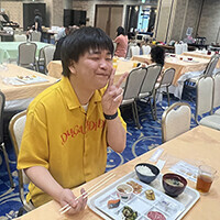 大場先生、ビュッフェを食べすぎでTシャツの上からでもお腹が・・・。