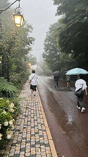 さぁ、目的地の「八ヶ岳高原」に到着しました〜!!う〜ん、雨だけど仕方ありません。むしろ、景色全体が霧に包まれたように見えて、幻想的です。日差しも遮ってくれますからね。とても涼しくて気持ちが良いです。