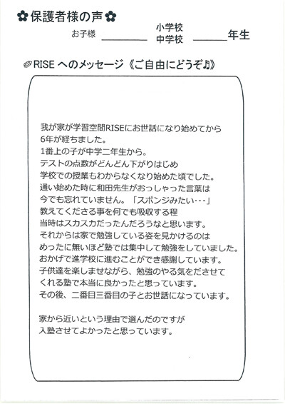 生徒・保護者さまの声|岐阜県不破郡垂井町で小学生・中学生の進学や受験のための学習塾に通うなら【THE学習空間RISE】